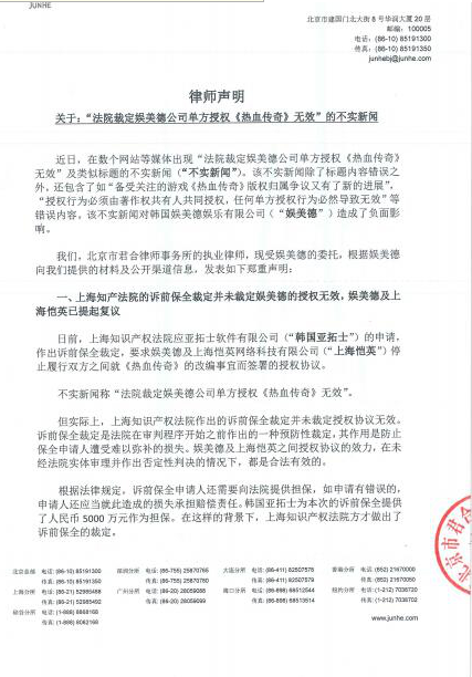 月日消息针对网上出现法院裁定娱美德公司单方授权热血传奇无效及类似标题的不实新闻娱美德表示上海知识产权法院作出的诉前保全裁定并未裁定授权协议无效但该不实新闻除了标