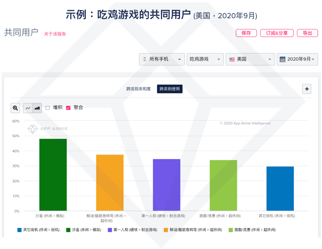 今年混合玩法最火的时候,App Annie 某客户曾考虑把一个用户量级非常大的博彩类游戏和一个 ARPU 值非常高的超休闲游戏组合成混合玩法,在用 App Annie 查看数据后发现这两个子分类游戏的用户交叉度较小,确认这一构想不成立,最终放弃采用。这一案例中客户使用的是 App Annie Game IQ 的共同用户功能。通过查看某个子分类中有哪些用户跟其他子分类用户的重合度和相似度,App Annie Game IQ 可以帮助开发者更精准地决策是否采用混合玩法,从而从源头规避产品设计和市场策略风险。