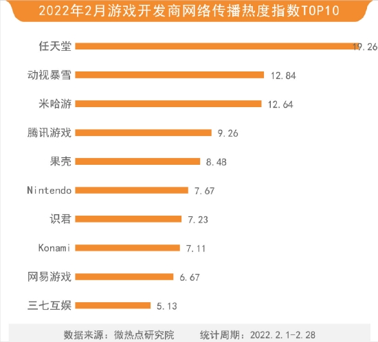 除游戏外,游戏开发商同样受到玩家关注。其中,任天堂与元宇宙相关话题、任天堂前设计师免费开放像素画素材网站和任天堂后续发展问题都成为讨论热点。动视暴雪以12.84的热度位列第二,米哈游、腾讯游戏、果壳、Nintendo、识君、Konami、网易游戏、三七互娱也分别上榜。