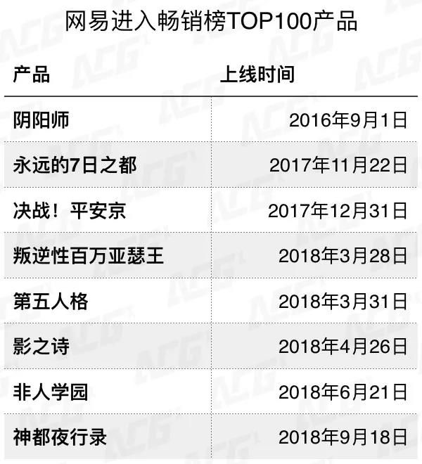 不过ACGx需要指出的是,这些游戏产品之所以能够拥有良好的市场表现,除了游戏本身质量过硬、IP号召力足够大以外,与腾讯游戏本身强大的发行能力也有着紧密的联系。在众多2018年上架的二次元游戏中,《妖神记》是唯一一款曾进入畅销榜前10的国产IP改编游戏,其IP最初是来源于小说,后又相继推出了同名漫画和动画。不过考虑到其小说已经进入“月更”状态,而漫画、动画每一次更新的内容量其实也很难令人满意,其游戏能够有如此良好的表现,更多的是依托于腾讯游戏强大的发行能力,IP带来的产品加成其实是有限的。 2.网易游戏