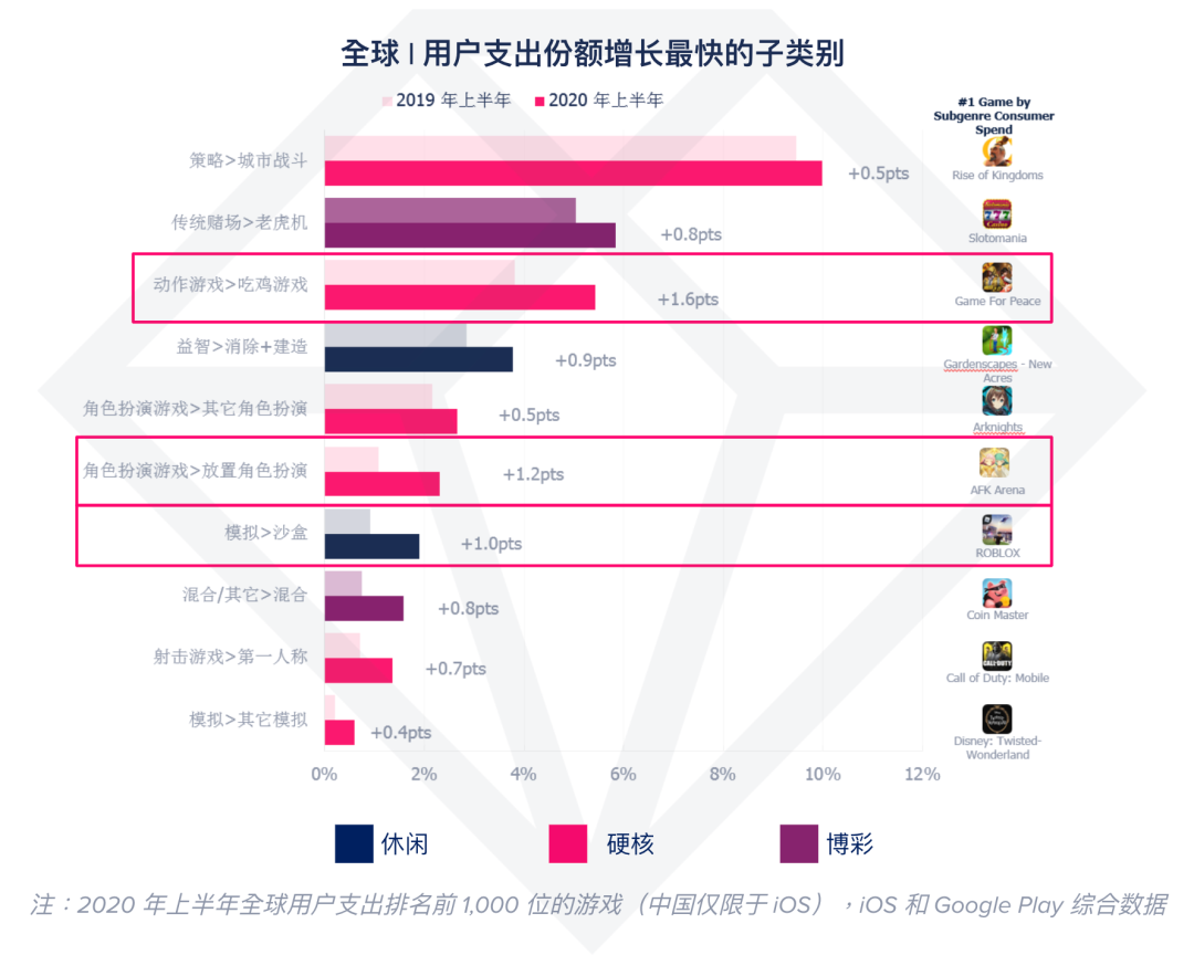 根据 App Annie Game IQ 数据分析,硬核游戏用户仍是玩家主力。全球游戏用户支出的 66%来自硬核游戏,23%来自于休闲游戏,另外 11%则来自于博彩游戏。硬核游戏中大部分的收入都是来自策略和 RPG 游戏的贡献。从今年上半年来看,休闲、硬核和博彩大分类都在增长,其中吃鸡类游戏、以《剑与远征》为代表的 RPG 和 ROBLOX 等沙盒模拟游戏份额增长率最高。硬核游戏的代表《使命召唤:移动版》仅用 20 天就达到了 1 亿次下载的里程碑。
