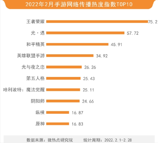 据微热点研究院数据,2022年2月,腾讯旗下的MOBA类手游王者荣耀仍是最受公众关注的游戏,以75.2的热度指数蝉联手游榜第一。2月,王者荣耀为了庆祝冬奥上线一种全新的限时玩法——冰雪快跑模式、诸葛亮荣耀典藏皮肤遭到网友抵制、王者荣耀与飞车手游联动上线新皮肤、元歌皮肤设计大赛等均引起广泛关注与讨论,助推王者荣耀热度提升。冒险类手游光·遇以57.72的热度指数排在榜单第二位,相关话题及无故封号、打击外挂和与红米手机性能冲突等问题引起广泛关注,从而带动游戏热度上升。和平精英以45.91的热度指数排在榜单第三位,热度较之前有所上升。