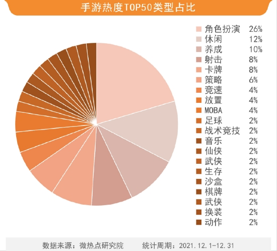 在最受网友关注的手游TOP50中,按照游戏类型划分,角色扮演类游戏仍最受公众欢迎,占比达26%。其次是休闲类游戏,详细可划分为休闲益智和休闲娱乐两种,占比达12%。