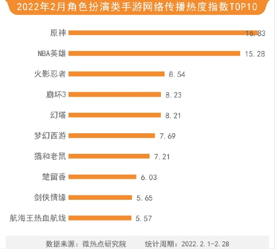 在本月角色扮演类手游中,手游原神以16.83的热度指数排在榜单首位,但与之前相较热度有所下降。NBA英雄以15.28的热度指数排在榜单第二位。火影忍者手游以8.54的热度指数排在榜单第三位。从整体来看,本月角色扮演类手游较之前相比有较大变化,崩坏三、幻塔和梦幻西游等手游热度较之前都有所下降。