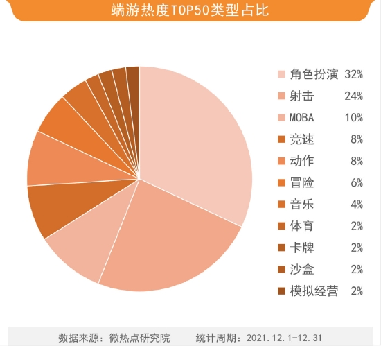 在端游热度TOP50排行中,有16款属于角色扮演类游戏,有12款属于射击类游戏,二者占比分别为32%和24%。无论手游还是端游领域,热度类型占比最高的都是角色扮演类。