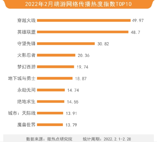 2022年2月,端游热度排行榜排名第一的游戏为穿越火线,热度指数为49.97。其中,穿越火线官方职业电竞赛事、现实版穿越火线等话题都助推其相关信息上涨。英雄联盟以48.7的热度指数排名第二,热度较之前有所下降。守望先锋、火影忍者、梦幻西游、地下城与勇士、永劫无间、绝地求生 、城市:天际线、魔兽世界分别位列三至十位。
