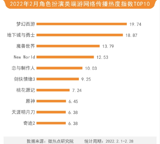 2月角色扮演类端游排行中,梦幻西游以19.74的热度指数蝉联榜首。梦幻西游全新推出嘉年华活动玩法和限时锦衣祥瑞等项目有效提升了游戏体验感,从而广受欢迎。地下城与勇士以18.87的热度指数位居第二。魔兽世界、New World、恋与制作人、剑侠情缘3同样引发关注,热度指数分别为13.79、12.53、10.03,位列榜单三至五位。